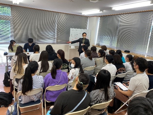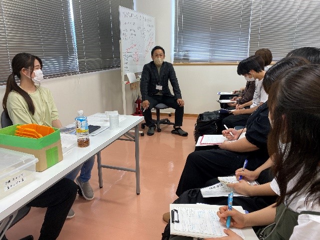 主任支援員の久保田将裕さんから障害者支援施設に関するさまざまなお話を聞かせていただき、支援員で保育士の本学卒業生滝川さん、支援員の田中さんからまもり苑の仕事内容やご利用者様との日々の関わりの様子などを教えていただきました。
